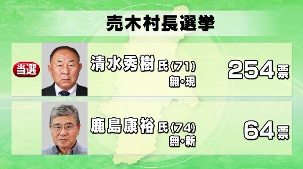 30日に投票が行われた長野県売木村(うるぎむら)の村長選挙は、無所属で現職の清水秀樹(しみずひでき)さんが4選を果たしました。