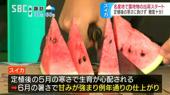6月の暑さで糖度上がって12.5度に!「ハイランドスイカで暑い夏を乗り切って…」名産地・信州松本波田で露地物の初出荷 2024年7月1日(月) 18:49 国内 寒さの影響もものともせず甘さは十分!上々の出来となりました。松本市で、露地物スイカの出荷がスタートです。スイカの名産地・松本市波田(はた)で1日から始まった露地物のスイカの出荷。地元の14軒の農家が育…