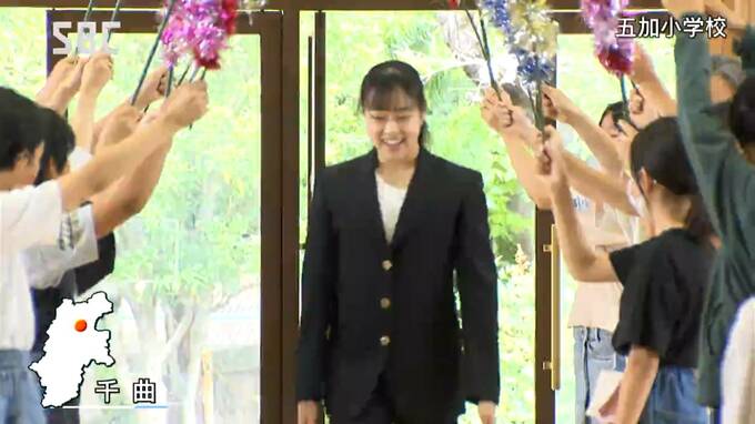 母校である千曲市の五加(ごか)小学校の児童に拍手で迎えられた和田選手。