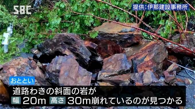 伊那建設事務所によりますと、2日早朝に職員が見回りをした際に、道路わきの斜面の岩が、幅20メートル高さ30メートルにわたって崩れているのを見つけました。
