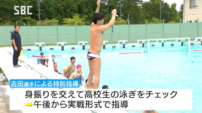 吉田選手は、声を掛けながら身振りを交えて高校生の泳ぎをチェックし、午後からは実戦形式で技術指導を行う予定です。