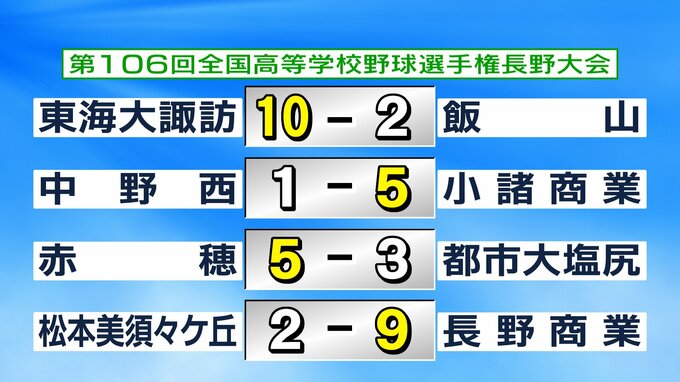 ▼しんきん諏訪湖スタジアムでは、東海大諏訪が飯山に7回コールド10対2で勝ちました。小諸商業は中野西に5対1で勝ちました。