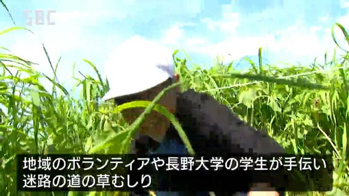 この日は、地域のボランティアや長野大学の学生に手伝ってもらいながら迷路の道の草むしりをしました。
