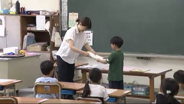 式の後、1年生の教室では初めての通知表が配られ、児童が緊張した表情で受け取っていました。