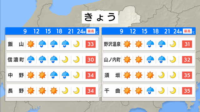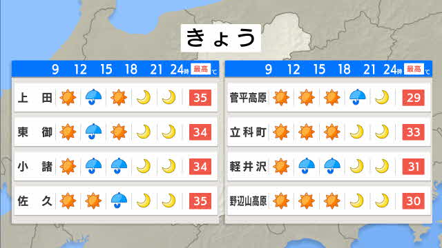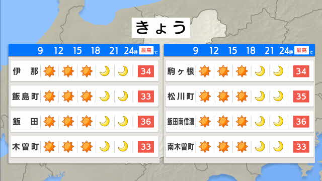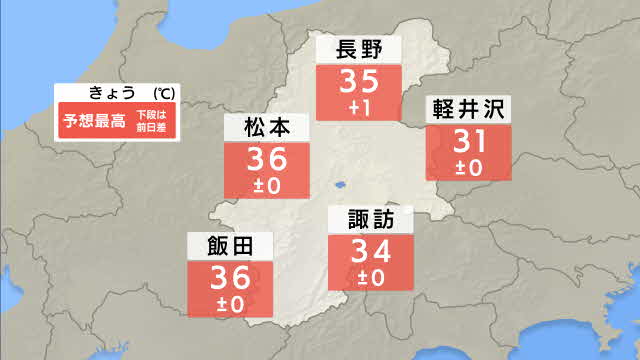 長野県内の23日の予想最高気温は、松本と飯田が36度、長野が35度、諏訪で34度などとなっています。