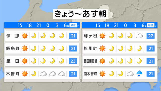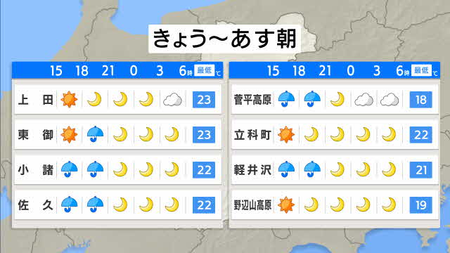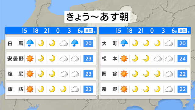 猛暑続く…38度予想の松本市 2日連続で熱中症警戒アラート発表 午後から大気不安定で局地的な激しい雨に注意 2024年7月23日(火) 11:30 国内 一方、23日は昼過ぎから夜遅くにかけて大気の状態が非常に不安定となる見込みで、長野地方気象台は、雷や竜巻などの激しい突風や局地的な激しい雨に注意するよう呼びかけています。 北部と中部では低い土地の浸水にも注意が必要だということです。
