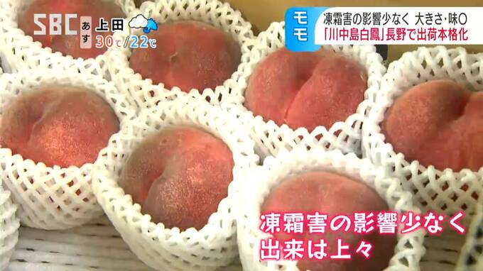 長野市篠ノ井にある共選所には、24日の朝に採れたばかりの「川中島白鳳(かわなかじまはくほう)」が持ち込まれ、等級ごとに箱詰めする作業が行われました。
