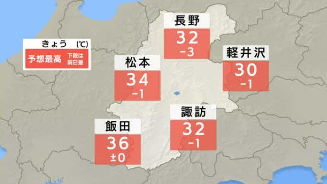 長野県内の予想最高気温は、飯田で36度、松本が34度、長野と諏訪で32度などと見込まれています。