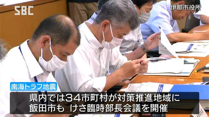 県内では南部を中心に34の市町村が南海トラフ地震の対策推進地域となっていて、飯田市も9日朝、臨時部長会議を開き、庁内の警戒態勢などを確認したということです。