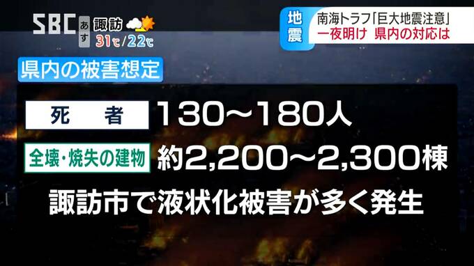 また、県内の死者は、およそ130人から180人、全壊または消失する建物はおよそ2200棟から2300棟、特に諏訪市で液状化被害が多く発生するとの想定です。