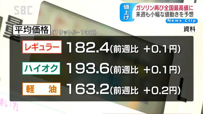 資源エネルギー庁によりますと、今週の県内のガソリン1リットルあたりの平均小売価格は、レギュラーが182.4円、ハイオクが193.6円で、ともに前の週より0.1円高く、5週ぶりの値上がりとなりました。
