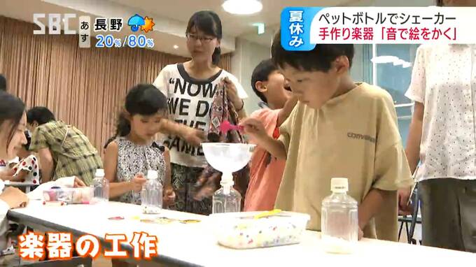 夏休みの子どもたちに音楽に親しんでもらうと、手作りの楽器を使って演奏するユニークなワークショップが開かれました。