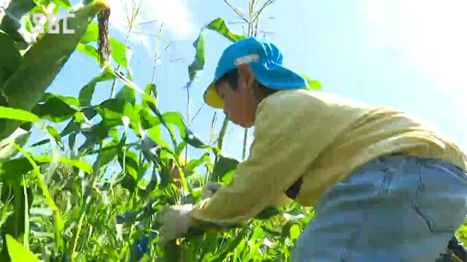 岡谷市樋沢(ひざわ)のトウモロコシ畑を訪れたのは、神明(しんめい)保育園の年長およそ30人で、農園の人にもぎ方を教わったあと、さっそく収穫を体験しました。