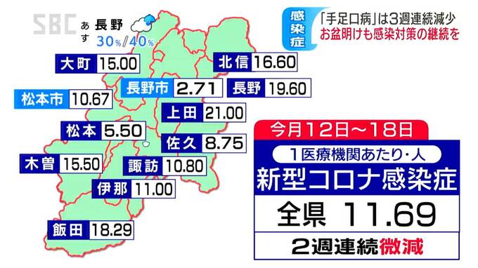 この夏、流行している「手足口病」の長野県内の感染者は、3週連続で減りましたが、県が引き続き注意を呼びかけています。
