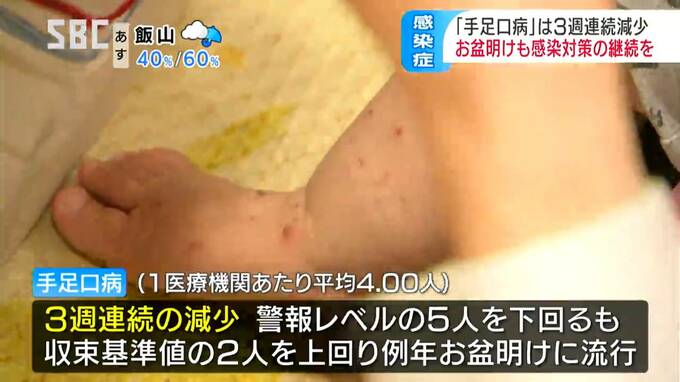 8月12日から18日までの1週間に県に報告された手足口病の感染者は、1医療機関あたり4.00人で、前の週より9.29人減りました。