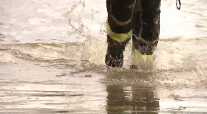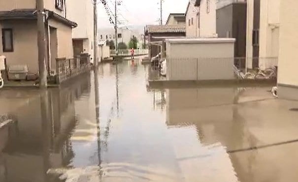 青木島町綱島では、住宅地の道路がくるぶしほどの高さまで冠水。