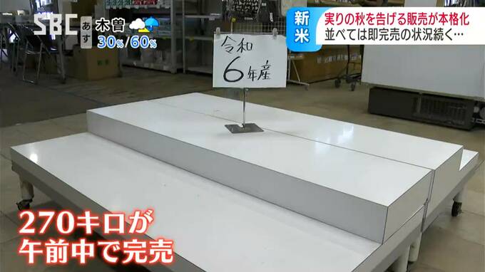 新米270キロ入荷も午前中で完売…玄米は1キロ400円余りで2割ほど高め「うれしいうれしいもう食べたい…」県外から訪れ買い求める人も 2024年9月10日(火) 18:22 国内 スーパーなどでは品不足の状況が続いていますが、松本市の道の駅に、新米が入り始めました。店頭に並べればすぐに売れていく状況で、価格も例年より高めだということです。松本市の道の駅・今井恵みの里。店内には…
