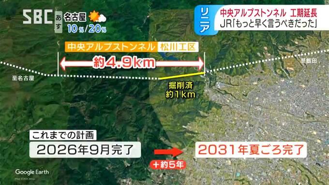 JR東海は17日夜、飯田市鼎切石(かなえきりいし)地区で開かれた住民に向けた説明会で、中央アルプストンネルの工事が当初の計画よりもおよそ5年遅れる見通しを示しました。