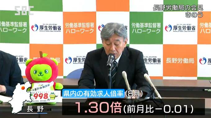 長野労働局によりますと、県内の8月の有効求人倍率は前の月を0.01ポイント下回る1.30倍でした。