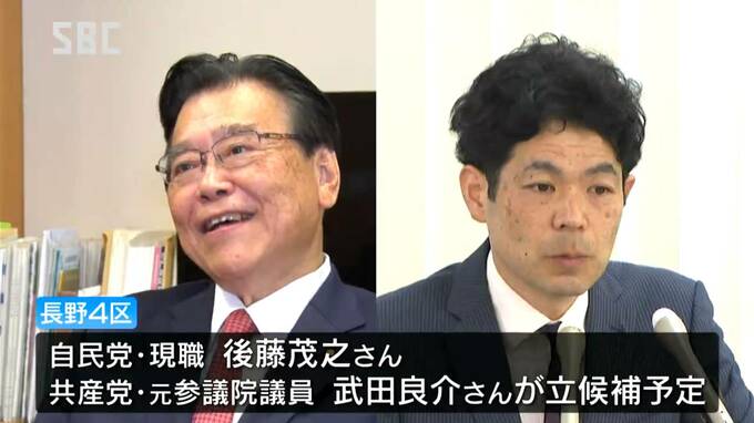 長野4区には、自民党現職の後藤茂之(ごとう・しげゆき)さんと、共産党で元参議院議員の武田良介(たけだ・りょうすけ)さんが、立候補を予定しています。