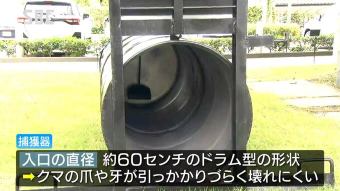 捕獲器は、入口の直径が、およそ60センチのドラム型の形状になっていて、従来の箱型に比べてクマの爪や牙が引っかかりづらく、壊れにくい特徴があります。