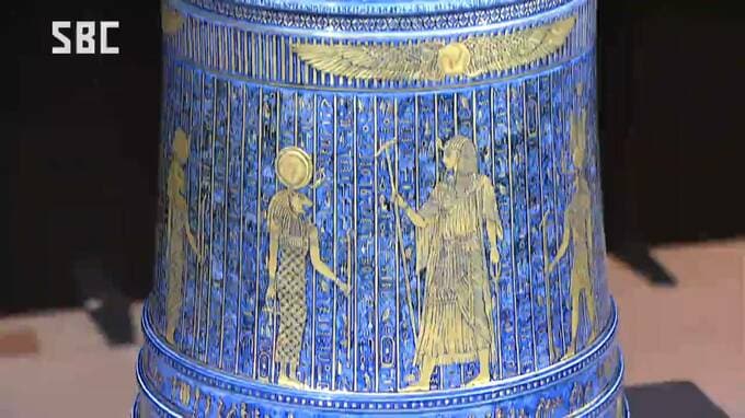 古代エジプトの民衆文字などが描かれ、自然現象などをイメージした模様が金色に浮かびあがる壺。
