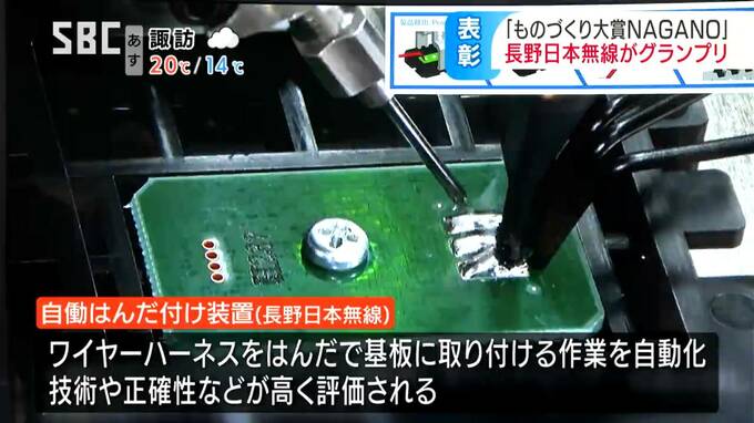 長野日本無線が開発したはんだ付け装置は、これまで職人の手で行われてきた柔らかいワイヤーハーネスをモーターなどの基板に取り付ける作業を自動化するもので、その技術や正確性などが高く評価されました。