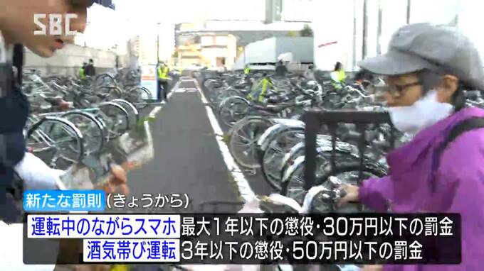 長野駅東口の駐輪場では、県警と県や市の職員およそ10人が、通勤・通学中の人に罰則強化を知らせるチラシやティッシュを手渡し、自転車の安全な利用を呼びかけました。