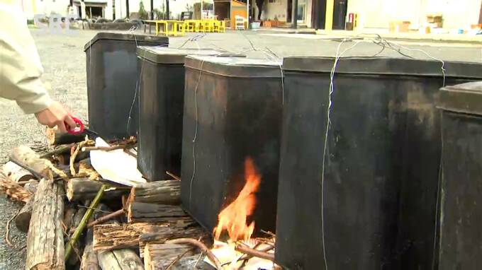 アルミホイルで包んで一斗缶に入れ、薪の上で1時間、じっくりと焼き上げます。