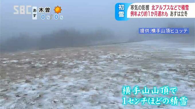 積雪は1センチほどで、横手山頂ヒュッテによりますと、例年より2週間ほど遅い初雪だということです。