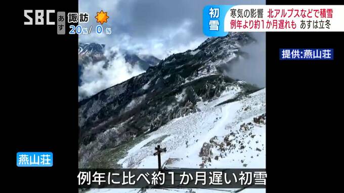 山頂近くの燕山荘のスタッフによりますと、例年に比べおよそ1か月遅い初雪ということです。