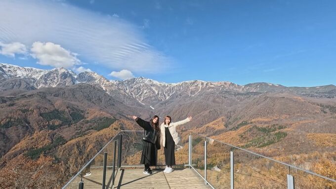 白馬岩岳マウンテンリゾートには、山頂のテラスがあり、標高差2200メートルを一望することができるとあって、紅葉と雪の北アルプスをバックに訪れた人が写真を撮影していました。