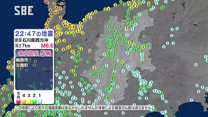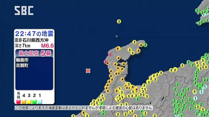 26日午後10時47分頃、石川県西方沖を震源とする地震があり、輪島市、志賀町(しかまち)で震度5弱、富山市、高岡市などで震度4を観測しました。