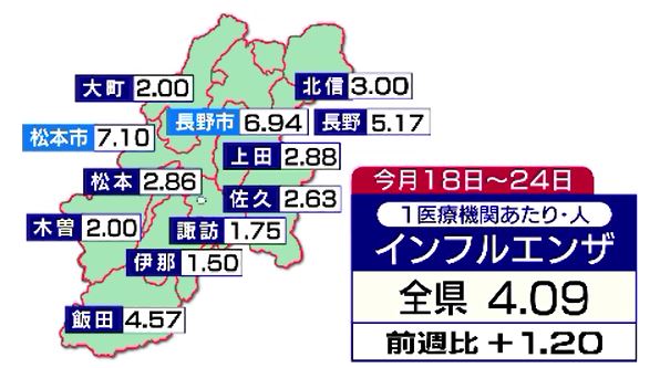インフルエンザ 患者の増加続く 学年閉鎖や学級閉鎖も 保健所別では松本市が7.10人で最多 長野市が6.94人、長野で5.17人 マイコプラズマ肺炎も0.25人増加 2024年11月27日(水) 18:14 国内 インフルエンザが流行期に入っている長野県内では、今週も感染者が増加し、学級閉鎖も出ています。11月18日から24日までの県内のインフルエンザの患者数は、1医療機関当たり4.09人で前の週より1.20人増えました…