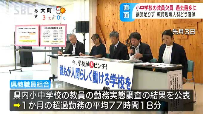 県教職員組合は10月、会見を開き、県内の小中学校の教員の勤務実態について、1か月あたりの超過勤務は、平均で77時間18分に上ると訴えました。