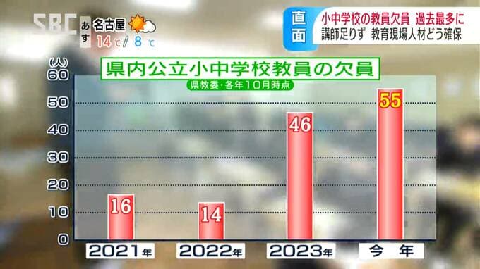 県教委によりますと、県内の公立の小中学校の教員の欠員は10月時点で55人となっていて、2023年より9人多く、2022年のおよそ4倍に上っています。