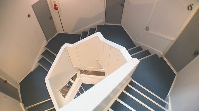 内側は吹き抜けのらせん階段で、宿泊室は放射状に配置されています。