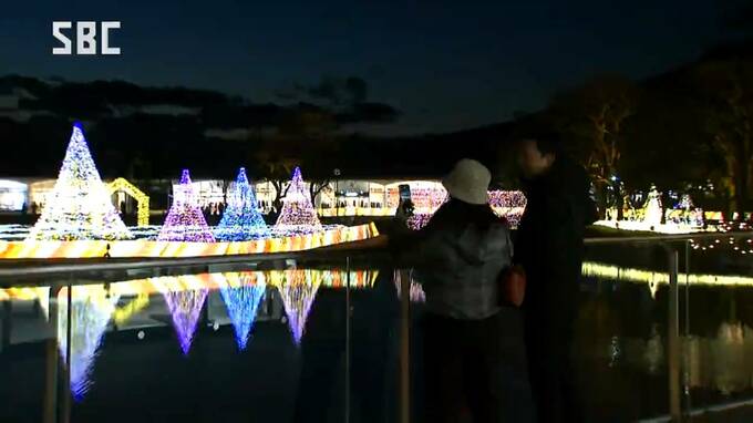 芝生ひろばの浮島に設置されたツリーの光が水面に映りこみ、幻想的な景色を楽しむことができます。