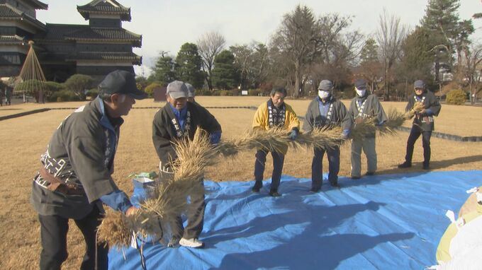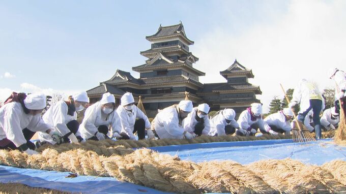 松本城の本丸庭園では、シルバー人材センターのメンバーなどおよそ30人が大きな掛け声をかけながらわらを編み込んでいきました。