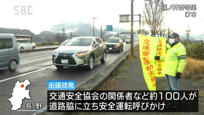 長野市篠ノ井西寺尾の交差点では、交通安全協会の関係者などおよそ100人が道路脇に立ち、安全運転を呼びかけました。