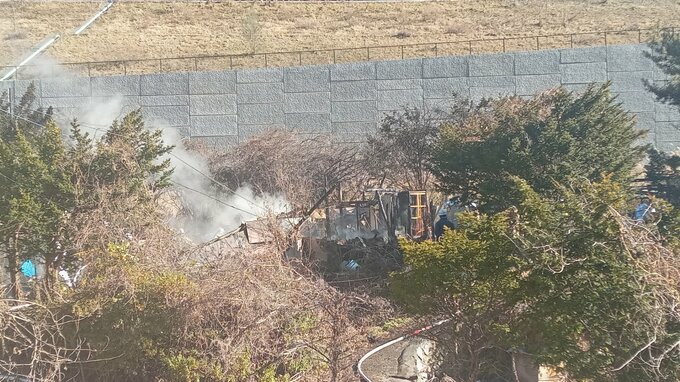 消防車7台が出て、火は正午ごろ鎮圧状態となりましたが、消火活動が続いています。