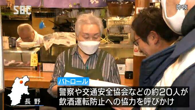 パトロールには、警察や交通安全協会、酒販組合などの関係者20人ほどが参加し、長野市の繁華街・権堂周辺の飲食店をまわって、飲酒運転防止への協力を呼びかけました。