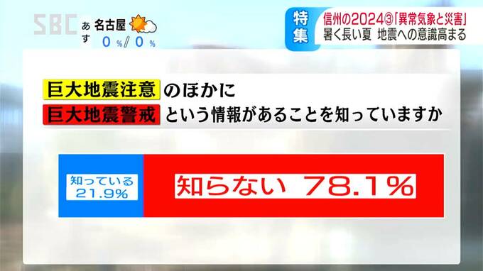 また、「臨時情報」には「巨大地震注意」のほかに、一段階上で事前の避難などを呼びかける「巨大地震警戒」があることを知らない人が、およそ8割いることもわかりました。