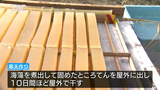 「天出し」は、海藻を煮出して固めたところてんを10日ほどさらし、凍らせながら乾燥させるものです。
