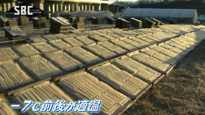 茅野市宮川の五味喜一(ごみ・きいち)商店では、12月7日から寒天作りが始まっていて、20日も担当者が白い息を吐きながら、寒天のもととなる「ところてん」を屋外に並べる「天出し」の作業が行われていました。