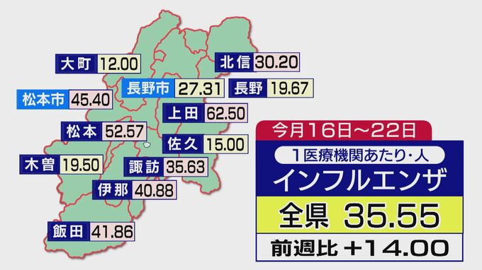 今季初 全県にインフルエンザ警報 上田保健所管内が62.50人で最多 松本、飯田、伊那、諏訪、北信、松本市で30人超 新型コロナも4週連続の増加 2024年12月25日(水) 17:39 国内 インフルエンザの感染者が急増していることから、長野県は25日、全県にインフルエンザ警報を出しました。12月22日までの1週間の1医療機関あたりのインフルエンザの感染者は、前の週に比べて14.00人増えて35.55人…