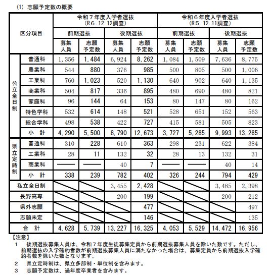 長野県内の2025年度の高校入試の志願者に関する2回目の調査結果がまとまり、公立高校の全日制普通科は、前期選抜が1.09倍、後期選抜が1.19倍となりました。