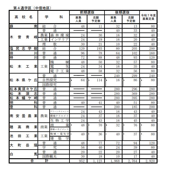 【全校一覧掲載】野沢北理数科10.75倍、伊那北理数科9.50倍【2025年度長野県高校入試志願者第2回調査】全日制普通科前期選抜1.09倍、後期選抜は1.19倍 2025年1月7日(火) 18:20 国内 ■第4通学区