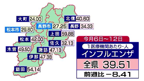 インフルエンザ8.41人減少も39.51人で4週連続で警報超えるレベル 上田保健所管内が59.88人で最多 新型コロナは10.80人で横ばい 2025年1月15日(水) 17:55 国内 長野県内のインフルエンザの感染者は、前の週に比べて減少しましたが、県は引き続き「インフルエンザ警報」を出して感染予防を呼びかけています。県によりますと1月12日までの1週間に確認されたインフルエンザの感…