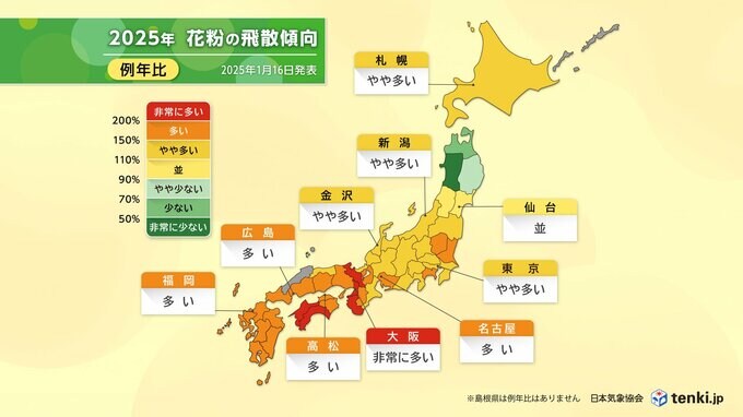 2025年春の花粉飛散量は、例年(過去10年の平均)に比べると、九州から北海道にかけてのほとんどの地域で多く、四国・近畿は非常に多い所もあるでしょう。東北北部は例年より少ない見込みです。